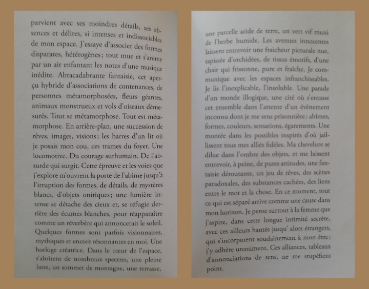 J’essaye d’associer des formes disparates, hétérogènes ; tout mue et s’anime par un air enfantant les notes d’une musique inédite. Abracadabrante fantaisie, cet aperçu hybride d’associations de contenances, de personnes métamorphosées, fleurs géantes, animaux monstrueux et vols d’oiseaux démesurés. Tout se métamorphose. Tout est métamorphose. En arrière-plan, une succession de rêves, images, visions ; les barres d’un lit où je posais mon cou, ces trames du foyer. Une locomotive. Du courage surhumain. De l’absurde qui surgit. Cette épreuve et les voies que j’explore m’ouvrent la porte de l’abîme jusqu’ à l’irruption des formes, de détails, de mystères blancs, d’objets oniriques ; une lumière intense se détache des cieux et, se réfugie derrière des écumes blanches, pour réapparaître comme un réverbère qui annoncerait le soleil. Quelques formes sont parfois visionnaires, mythiques et encore résonnantes en moi. Une horloge créatrice. Dans le cœur de l’espace, s’abritent de nombreux spectres, une pleine lune, un sommet de montagne, une terrasse, une parcelle aride de terre, un vert vif muni de l’herbe humide. Les avenues innocentes laissent entrevoir une fraicheur picturale nue, tapissée d’orchidées, de tissus émotifs, d’une chair qui frissonne, pure et fraîche. Je communique avec les espaces infranchissables. Je lis l’inexplicable, l’insoluble. Une parade d’un monde illogique, une cité où s’entasse cet ensemble dans l’attente d’un évènement inconnu dont je me sens prisonnière : abîmes, formes, couleurs, sensations, égarements. Une montée dans les possibles inspirés d’où jaillissent tous mes alliés fidèles.